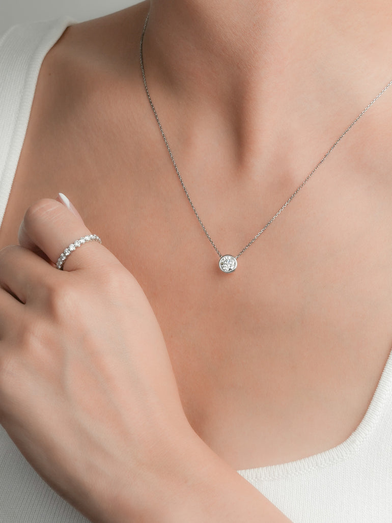 1ctのラボグロウンダイヤモンドをふくりんで囲ったネックレス。
