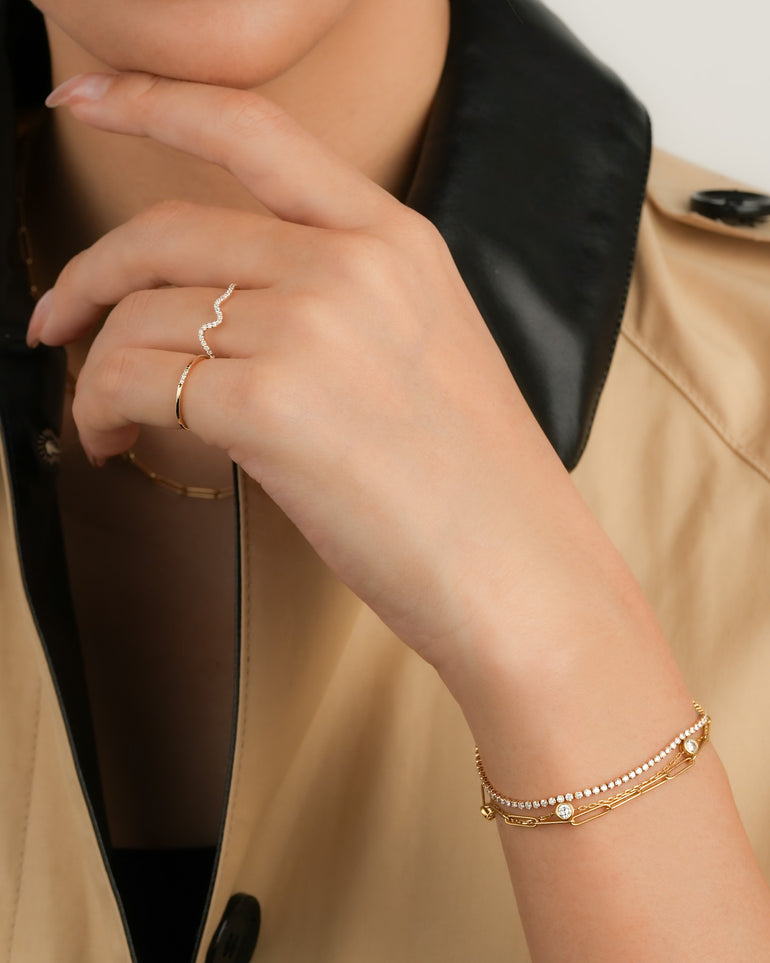 華奢ながらも印象的なシルエットで、重ね付けをしても、ひとつでも映えるデザインです。